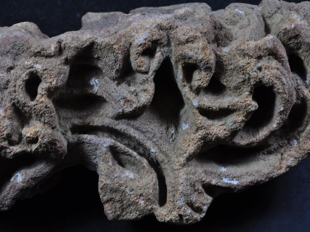 It s a Fragment of Architectural Member made of stone, Colour is brownish. It swell decorated and design is clearly visible. It s all sides are broken. Deposition of dust and dirt. Rubbing on the surface and flaking on it.