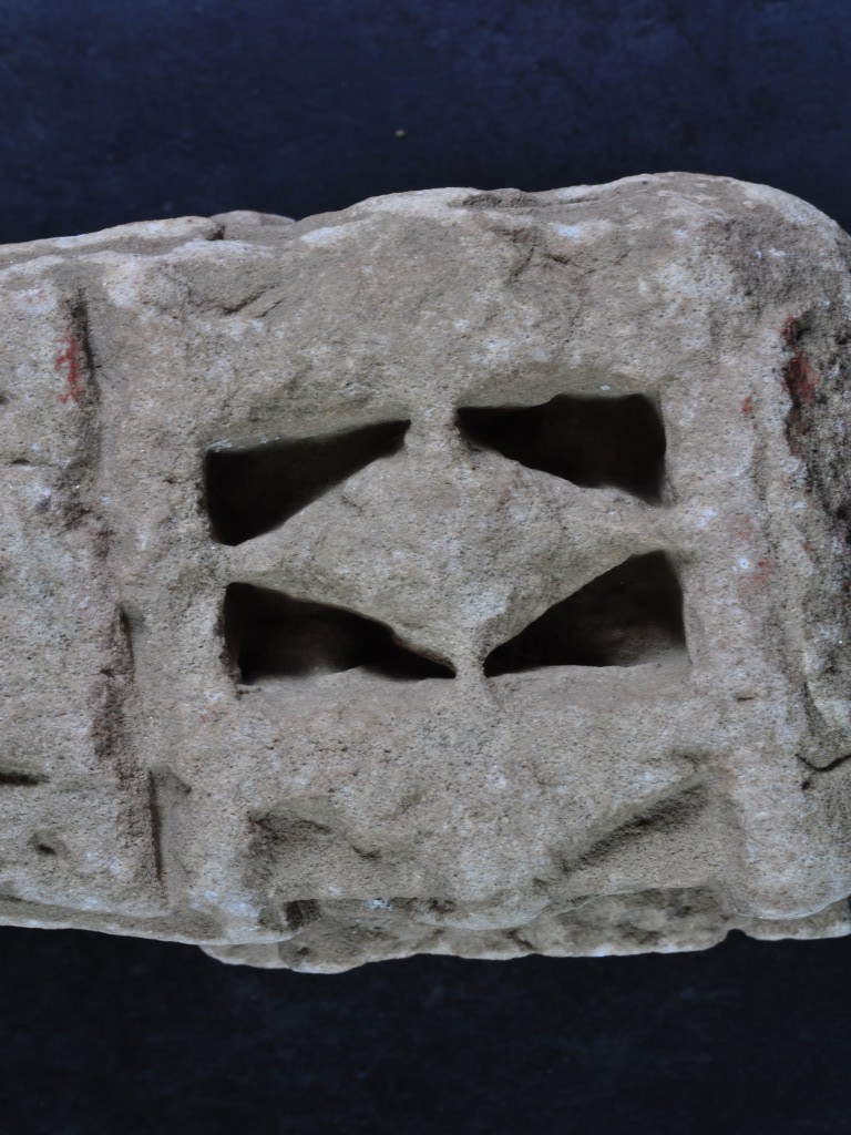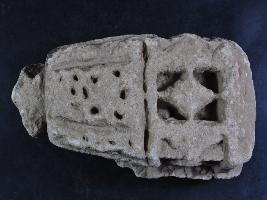 It s a Fragment of Architectural Member made of stone, Colour is brownish. It s pinned design, incise lines, flower design on it and temple shape. It s all sides are broken. Deposition of dust and dirt. Rubbing on the surface and flaking on it.