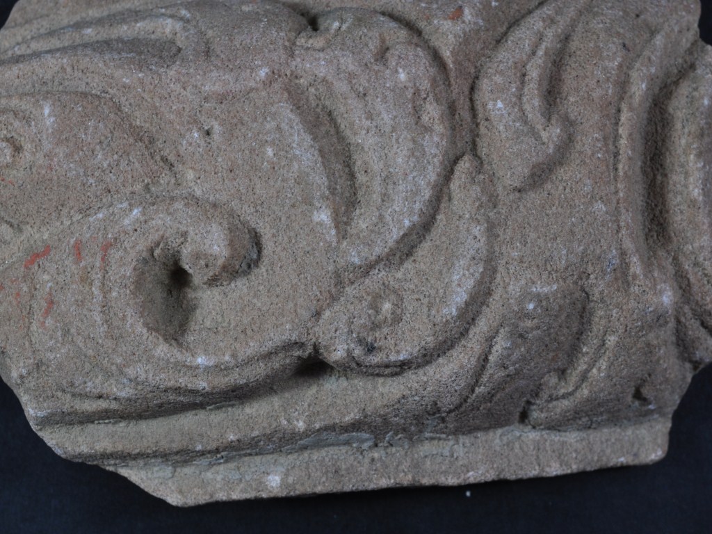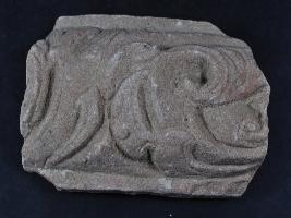 It s a Fragment of Architectural Member made of stone, Colour is brownish. It s well decorated and design is clearly visible. It s all sides are broken. Deposition of dust and dirt. Rubbing on the surface and flaking on it.
