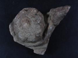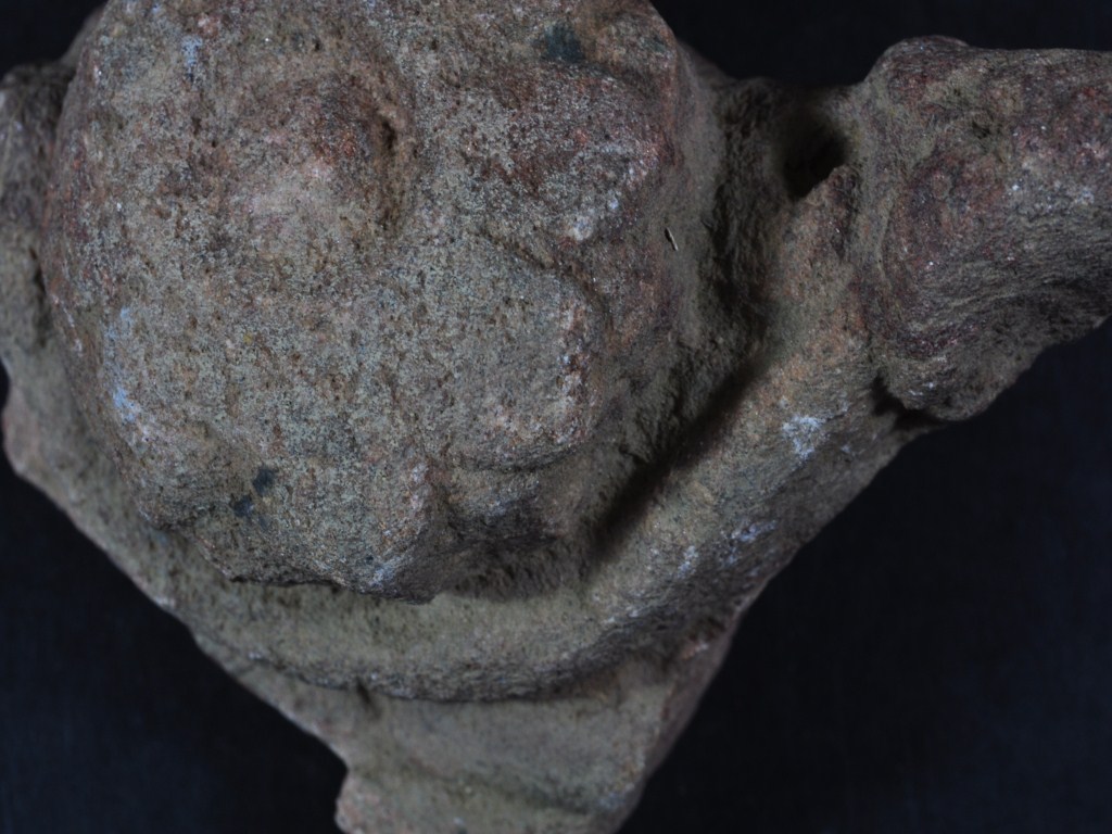 It s a Fragment of Architectural Member made of stone, Colour is brownish. It s lotus with leaf design on it and design is clearly visible. It s all sides are broken. Deposition of dust and dirt. Rubbing on the surface and flaking on it.