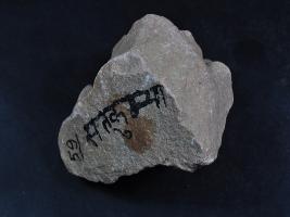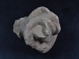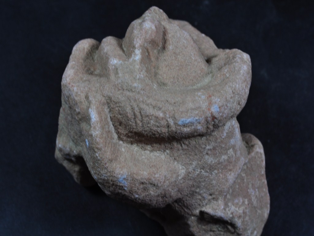 It s a piece of pillar made of stone, Colour is brownish. A bud design on it and design is clearly visible. It s all sides are broken. Deposition of dust and dirt. Rubbing on the surface and flaking on it.