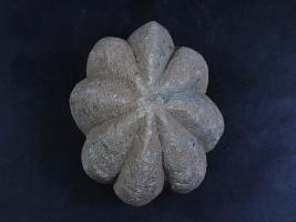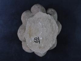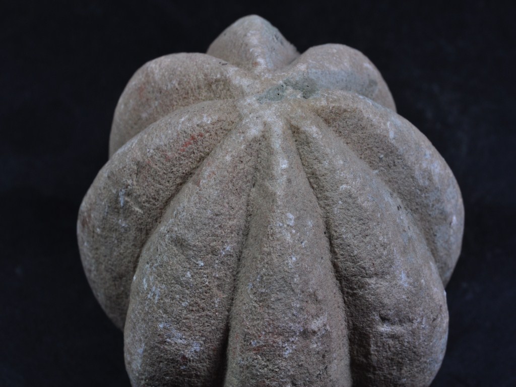 It s a piece of pillar made of stone, Colour is brownish. It is like a mace Gada and bottom portion is broken. Deposition of dust and dirt. Rubbing on the surface and flaking on it.