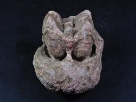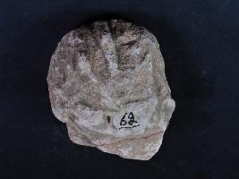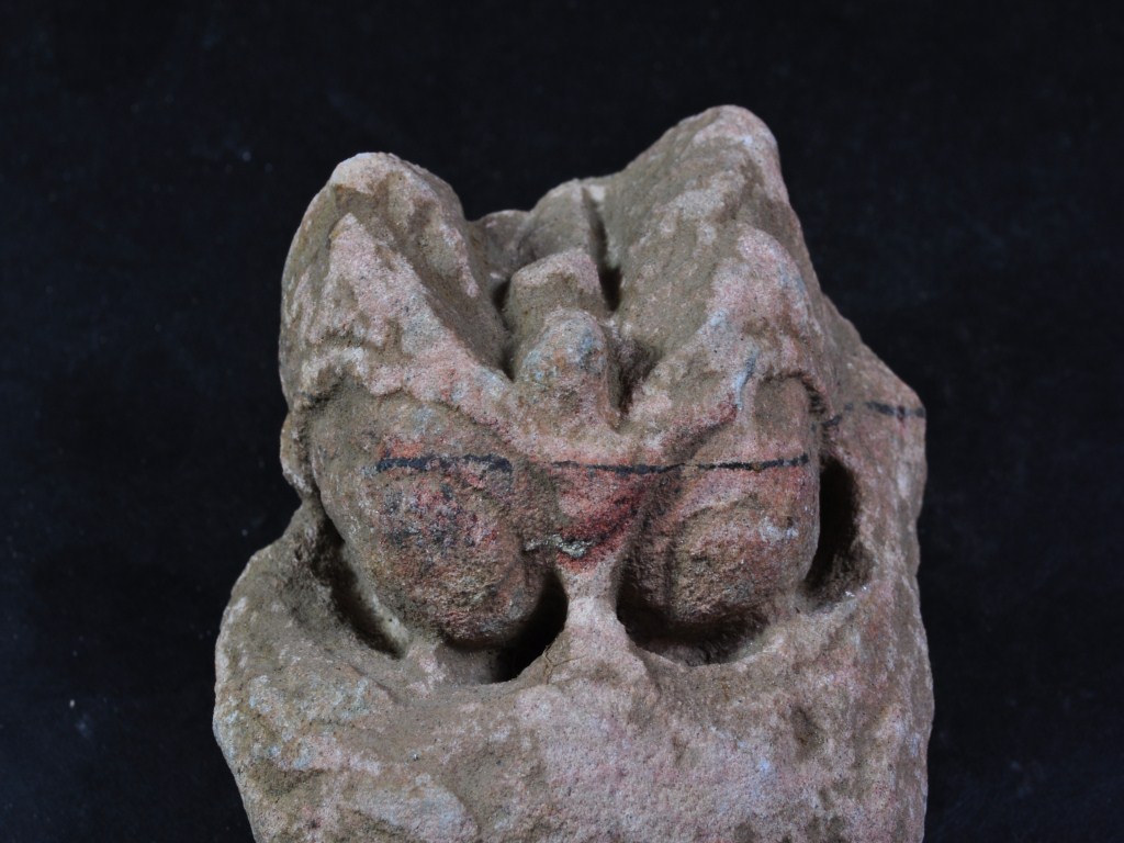 It s a piece of pillar made of stone, Colour is brownish. It s decorated design on it and all sides are broken. Deposition of dust and dirt. Rubbing on the surface and flaking on it.