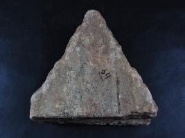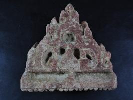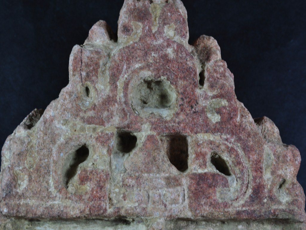 It s a piece of pillar made of stone, Colour is brownish. It is well decorated and design is clearly visible. It s all sides are broken. Deposition of dust and dirt. Rubbing on the surface and flaking on it.