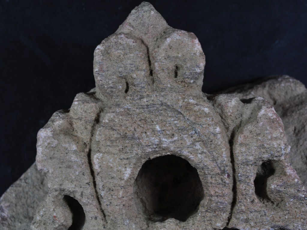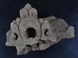 It s a piece of pillar made of stone, Colour is brownish. It is well decorated and a pit design on it. It s all sides are broken.Deposition of dust and dirt. Rubbing on the surface and flaking on it.