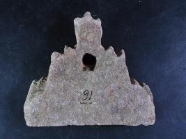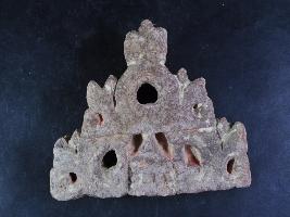 It s a piece of pillar made of stone, Colour is brownish. It is well decorated and design is clearly visible. It s a hole on it and all sides are broken. Deposition of dust and dirt. Rubbing on the surface and flaking on it.