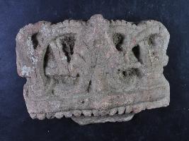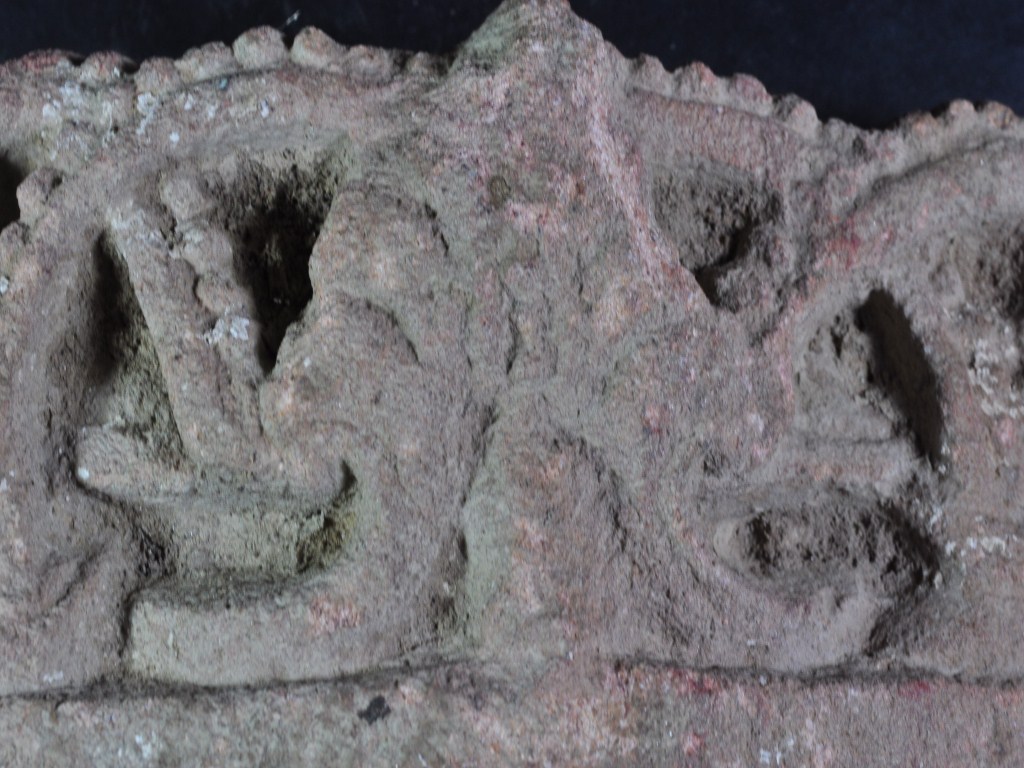 It s a piece of pillar made of stone, Colour is brownish. It is well decorated and design is clearly visible. It s all sides are broken. Deposition of dust and dirt. Rubbing on the surface and flaking on it.