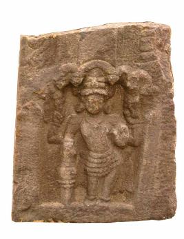 | Description / विवरण | Broken part of vertical door jamb. Dwarapalaka with four hands standing in dwibhanga posture. The rear hands hold sankha and chakra while the two front hands are in varada and abhaya-mudras. |