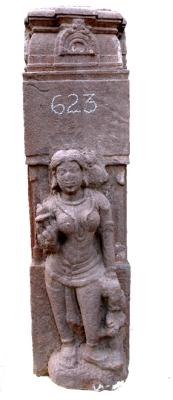 | Description / विवरण | A Pillar showing a kantashaped niche, in the bottom part is a female standing on a tortoise Yamuna with dishevelled hair, her right hand holds a flower like object while the left hand hangs down touching the head of an unknown Object. She is decorated with a necklace and a long hara which falls down below the chest. The arms are adorned with keyuras. While the drapery is seen around the thigh in three folds with a long tassel falling in between the legs. The legs are adorned with anklets and manjiras on the feet. |