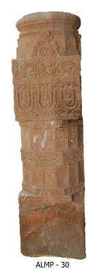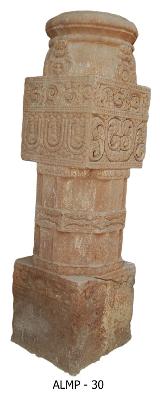 | Description / विवरण | A pillar having a square base followed by fluted shaft intercepted by a designed patta, a square top with jeweled design and a floral design separated by a beaded patta, fluted neck with chaitya window motif on four sides and finally it is crowned by a circular disc with fluted design. |