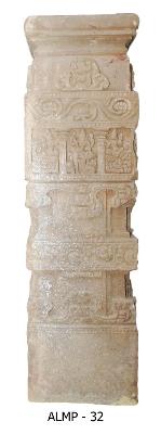 | Description / विवरण | A pillar having a square base and top, intercepted by broad pattas. The top square is depicted with saivate themes, each in three horizontal panels. On one of the central panels shows a figure of Mahishasuramardini flanked by attendants. |