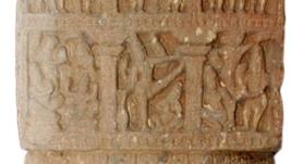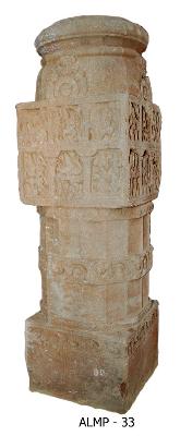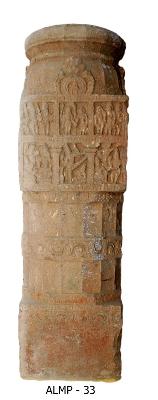 | Description / विवरण | Pillar having a square base and top intercepted by broad pattas. The top square is divided horizontally in two sections. Each section has three panels. They are depicted with scenes from dasavatara and bhagavata. In one of the central panels in the lower section shows Siva as Trivikramamurti. In the other central panel depicts Vishnu as Hiranyakasyapu. |