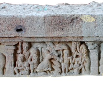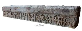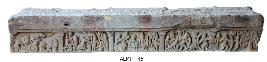 Lintel depicted with five panels separated by pilaster motifs. The first one shows a man reclining on his left elbow and surrounded by a fox, serpent and an elephant with its head bent. In the second panel there is a blindfold lady feeding her baby, a rishi standing, a swan swallowing a fish, another rishi holding a chhatra and a man probably doing penance, keeping his body upside down in sirshasana with his legs and hands slightly bent and stretched obliquely. In the third panel are shown Uma Maheswara seated on a pitha and surrounded by rishis and nandi. The fourth panel represents the story of Kiratarjuneeya . The fifth panel shows a male figure who is about to release an arrow against two human beings, one catching hold of the other hanging from a tree. There is an inscription on the top portion.