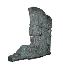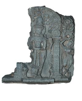 | Description / विवरण | Broken part of a door jamb. The Sakha part is depicted with a vaisnavate dwarapala within niche decorated with foliage arch rested on a plaster motif. He is represented with four hands, the right upper and lower hands are broken. He holds sankha in his upper left hand and placed his fore left hand on the mace. He is richly ornamented with kanthaharas, necklaces, armlets, wristlets, anklets, purnoruka tied with waist-band and long hanging tassel between the legs and an ornamental head gear. A pair of lady attendents on either side near his legs. On the left side of the pilaster is a lady attendant standing in cross legged holding a branch of tree with her raised right hand. |