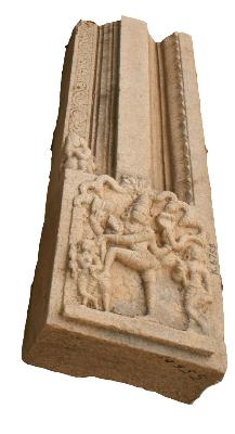 | Description / विवरण | Door jamb decorated with foliage motifs and fluting designs. Lower part is depicted with standing dwarapalaka with the right leg raised and kept on the mace. Flanked by male and female attendants. He holds trident and damaru in his left hands, while the right hold serpent and the other kept in lola hasta posture. The whole panel is encircled by prabhavali with makara torana on the top. |