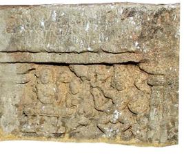 | Description / विवरण | The lintel has three registers. Each one is separated by pilaster motif. The first one shows katyayani Mahishamardani riding on a lion attacking the Mahisa who is defiantly standing before her, the second register depicts Lingodbhavamurti flanked by Brahma on his right side and Vishnu on his left side and the last one portrays the abduction of Sita by Ravana, in which Sita sat on a chariot drawn by horses and Ravana on the ground fighting with Jatayuvu a bird . Ravana is shown with three faces, holding gada, with his fore hands and khadgha and shield in his upper left and right hands. There is an inscription on the upper part of the lintel in Telugu Kannada characters reading Mairddhambu, lingodhavambu, jadayuddhambu. |