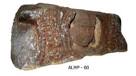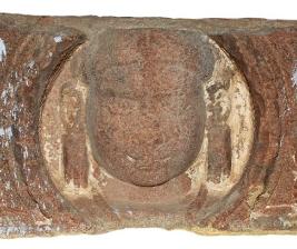 | Description / विवरण | An architectural member of sikhara depicted with a face of yaksha in a circular niche at the centre. He has long nose, round face, thick pointed chin, lenticular eyes, earlobes and fleshy cheeks. Hair is drawn back wards and tied with beaded band on the fore head. He wears long hanging jukas to ears and Kanthaharas. |