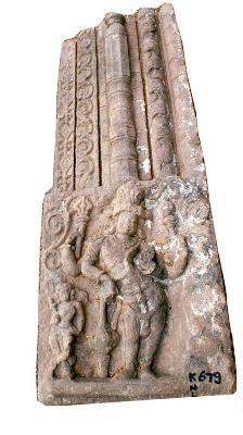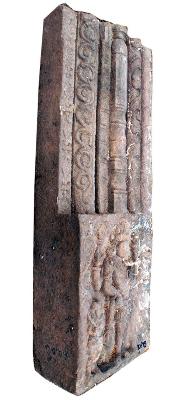 | Description / विवरण | Vertical pillar of the door jamb depicted with dwarapalaka holding trident, khatvanga, gada and the left forehand is in chin-mudra. It is depicted central pilaster motif and flanked by floral and fluting designs. |