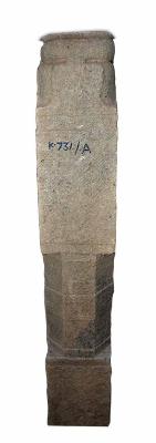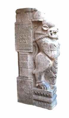 | Description / विवरण | Pillar showing rampant lion with wide open mouth and protruding and hanging tongue. Probably a man is pulling reins from behind the pillar. A baruvahaka figure is shown on the top. Underneath the base are circular mouldings. |