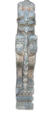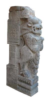 | Description / विवरण | Pillar showing rampant lion with wide open mouth and protruding and hanging tongue. Probably a man is pulling reins from behind the pillar. A baruvahaka figure is shown on the top. Underneath the base are circular mouldings. |