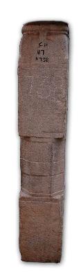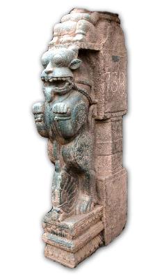 | Description / विवरण | Pillar showing rampant lion with wide open mouth and protruding and hanging tongue. Probably a man is pulling reins from behind the pillar. A baruvahaka figure is shown on the top. Underneath the base are circular mouldings. |