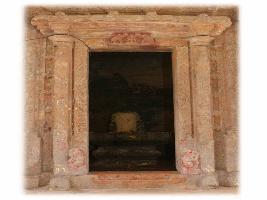 | Description / विवरण | View of garbha griha of Siva temple with door jamb depicted with lalata bimba containing the Gajalakshmi motif in the centre. There are two verticals with dwarapalas on either side at the bottom. |