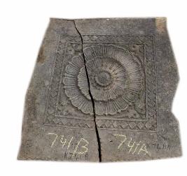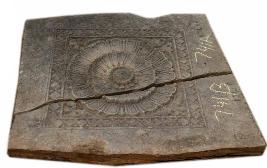 | Description / विवरण | The square slab with fully blossomed lotus moulding with a bud in the middle. Probably a ceiling slab of temple. |
