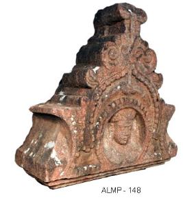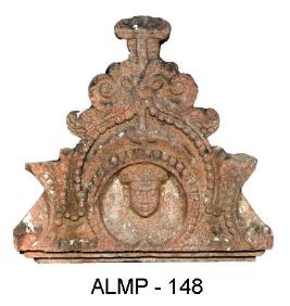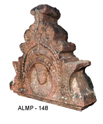 Kudu arch an architectural member of a sikhara of temple, depicted with chaitya shaped motif with a circular niche at the centre decorated with a beaded decoration all around. It is designed in stepped pyramidal form with a flat finial at the top, which is portrayed head of a human figure. His combed hair is arranged with a flat top bun. He has oval face, closed eyes, kundalas, long nose, thick lower lip and fleshy cheeks.