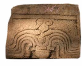 | Description / विवरण | Moulding of a roll corbel emerging from either end of a beam and touching each other in the centre with pushpapodhika pointing downwards. The roll corbel is in five strands running in curved pattern in the form of a festoon with Srivatsa motif on the top. |
