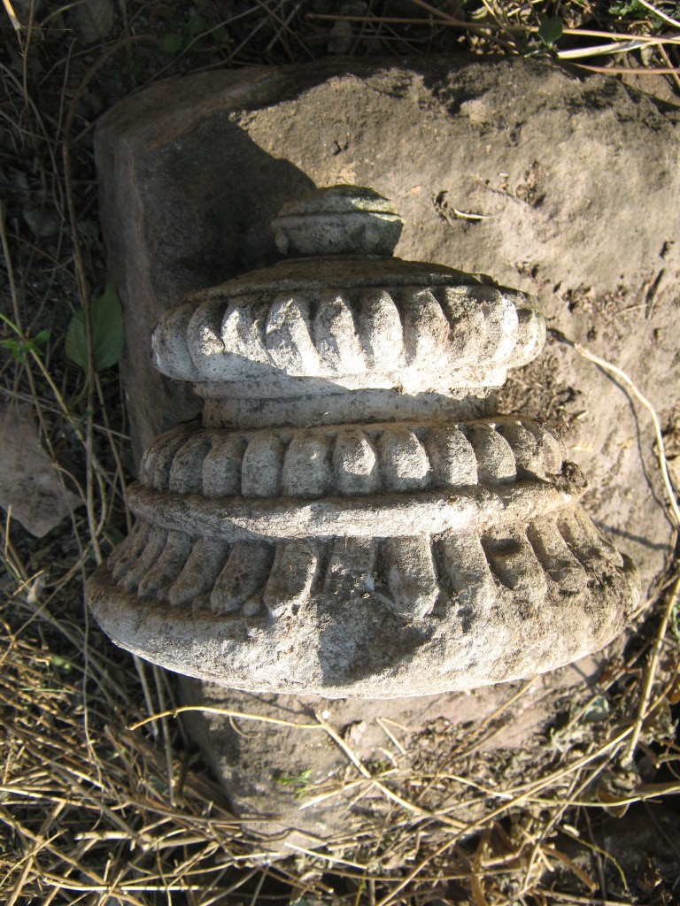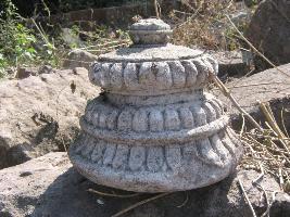 The stone has 3 steps of carvings. Upper has a knob like projection. Below it amalaka like decoration is visible. The lower part is also mode in two phases as invented lotus toped by amalaka projection.