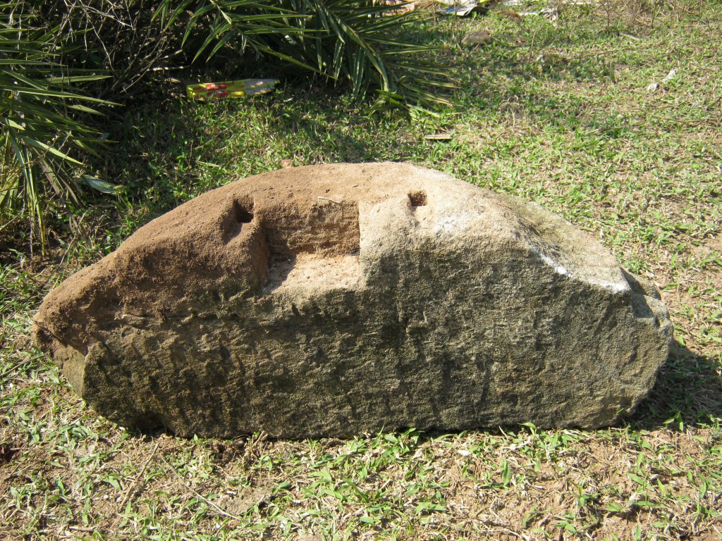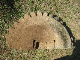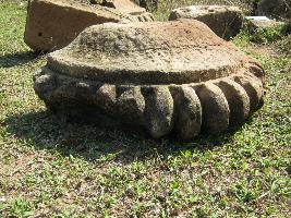 The stone block has the carving of amalaka stone. It is available from its half only. On the top a deep rectangular socketing hole is visible. Two grooving marks are visible on two sides of the large hole.