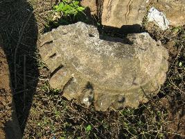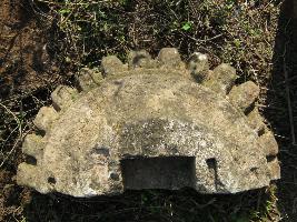 | Description / विवरण | Amalaka stone is available in half only from the original one. A rectangular deep hole is visible on the top. This hole is flanked by two small groove marks used for individual. |