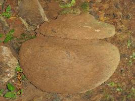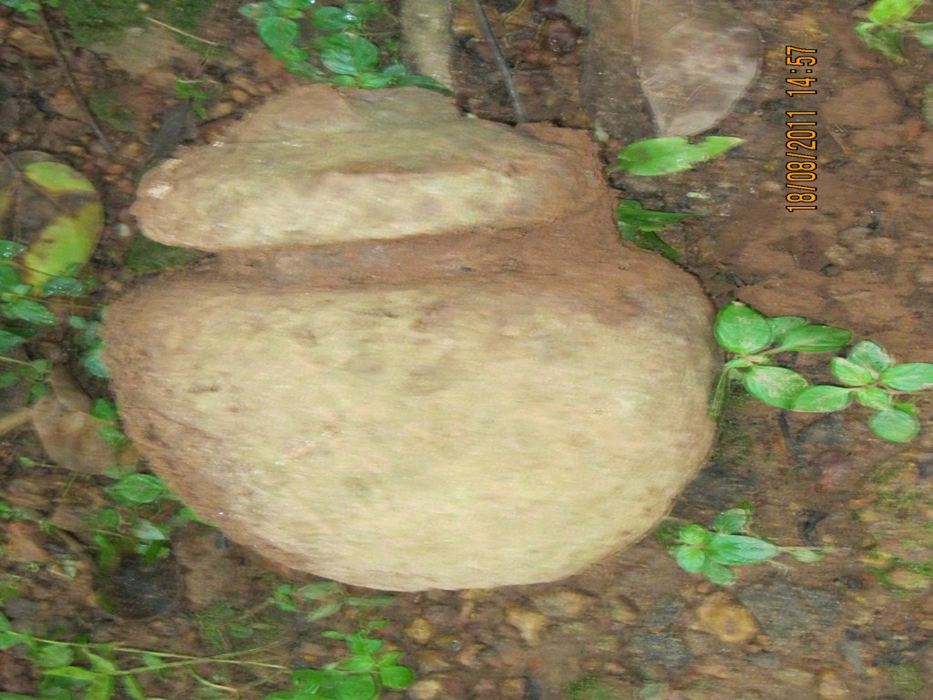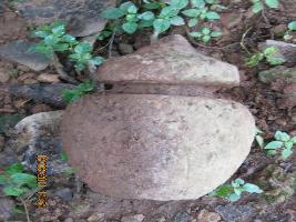 A small Kalasa. Once a part of a small temple lying under a banyan tree. It is tapering from neck to base, deep neck, thick and flaring rim, above the rim is a projection suitable for staf flag.