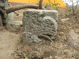 | Description / विवरण | Fragment of architectural member has decorations on one side only. Very minute carvings of crepers and beaded designs are visible. It is prtially burried under the soil. |