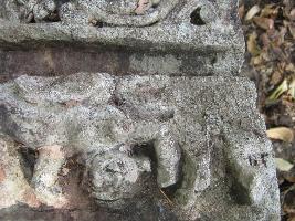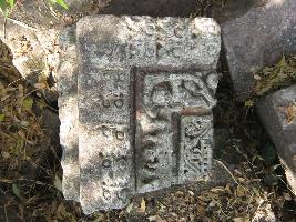 | Description / विवरण | The stone slab indicateding the one corner of the door jamb with 3 sakha design. The entire piece is covered with moss and lichen growth. |