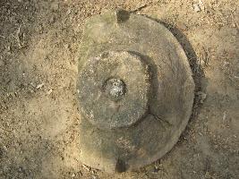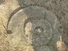 | Description / विवरण | Circular fashioned stone having 3 tanku decorations on the edge of the border.Centre is projected and a hole is seen. |