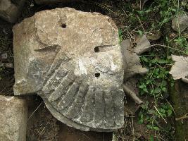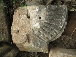 Stone slab is having the carved slope petal like projection. The carved part is circular in fashion, one side is projected . Centre is projected with a corner.