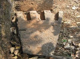 | Description / विवरण | The piece of Amalaka shila is in conical shape. Chiselling marks are clearly visible on surface. Two socketing marks are also seen, conical end is missing. |