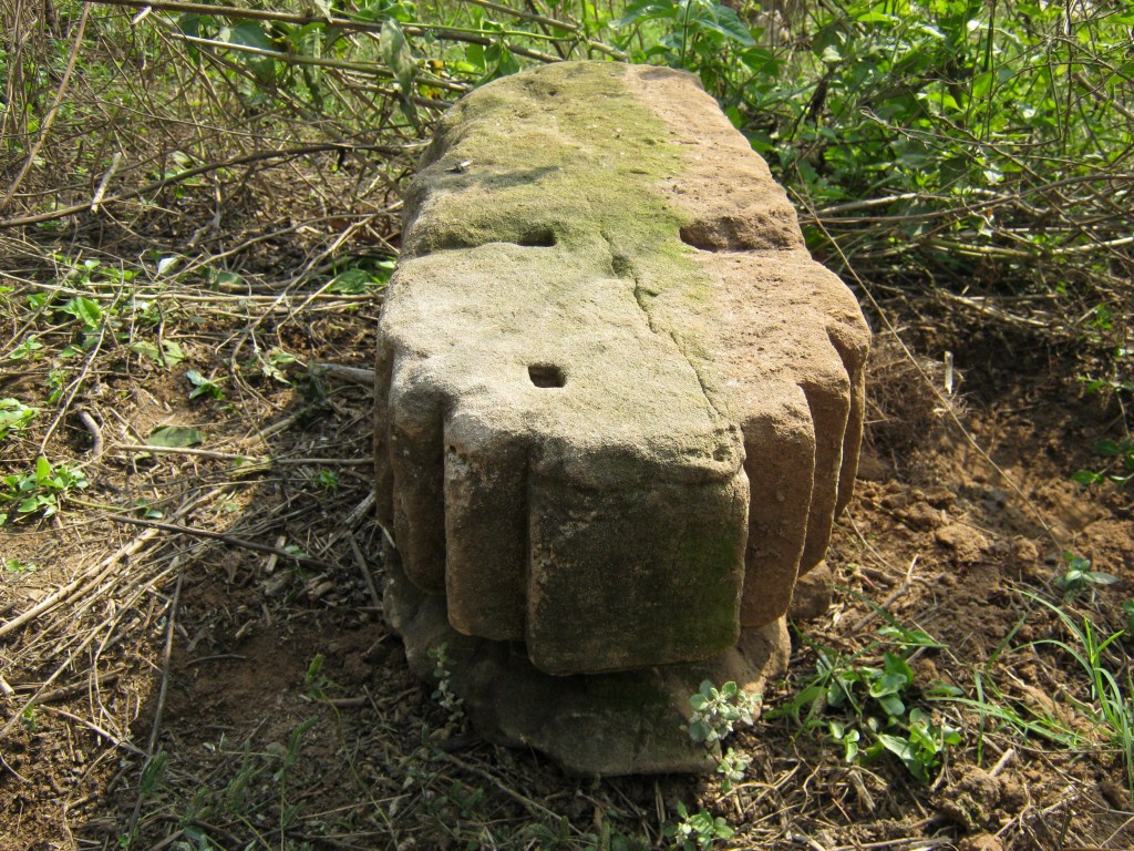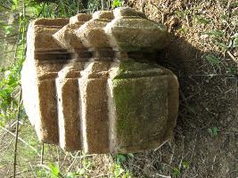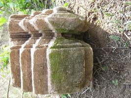 The stone is elongated and one of its ends has two moulings. Lower is thin and angular in shape. Other is flat and wider.
