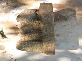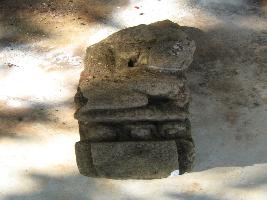 | Description / विवरण | Fragment of architectural member Lower part is visible. On the pedestal one crouched human figure is carved, on the head of this image the creature is standing. Only foot impression is visible on the head. Both bottom end and top end are broken. |