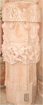 | Description / विवरण | A round pillar decorated with floral design band at top and scroll with Kirti Mukha below. A band of human figures carved flying posture at middle. The lower part has chain and bell hang down on each face. |