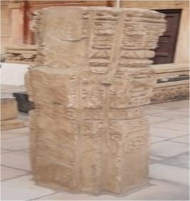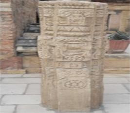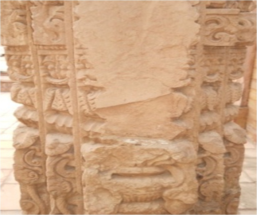 The decoratd pillar has three projection on both face, having highly carving of several designs. Main central offset has full bloomed lotus, ghatpallav, lotus leaves and other floral designs.