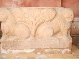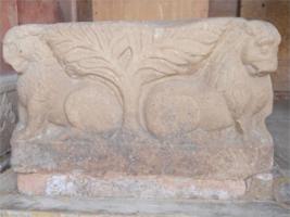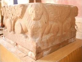 A lower portion of lion capital showing figures of lion seated in all four sides in uposite direction, while tree is in centre. The faces of lions at the columns are confined.