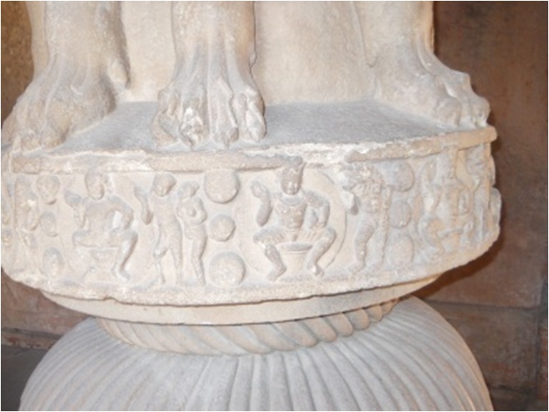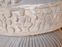 The capital is a magnificent creation of Gupta art, the one with the four addorsid lions, though not so highly polished as much earlier in Ashokan capitals. The four beast on the abacus of Ashokan capitals replaced here by Anthropomorphised forms of the twelve indian signs of the Zodiac. They shown associated with the 12 months, all represented with Abhay mudra and with a pot in left hand.