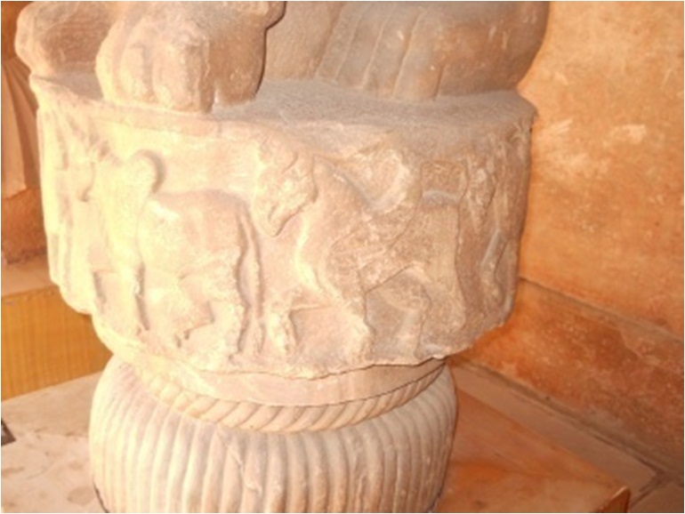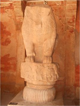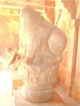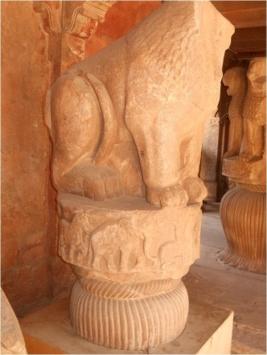 Capital has representation of an inverted lotus or bell flower with numerous petals below the abacus. This lion sejant is depited as an extra ordinarily powerful beast with a some what unnaturally massive built lacking the proportion and beauty of its proto type. Its abacus present a delightful variety of composite animals, where in one finds free re in given to imagination. Winged and beaked beasts, rare in Indian sculptures. The funniest of these figures is that of a winged mule having a bearded human head, with a couple of horns.