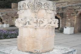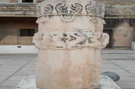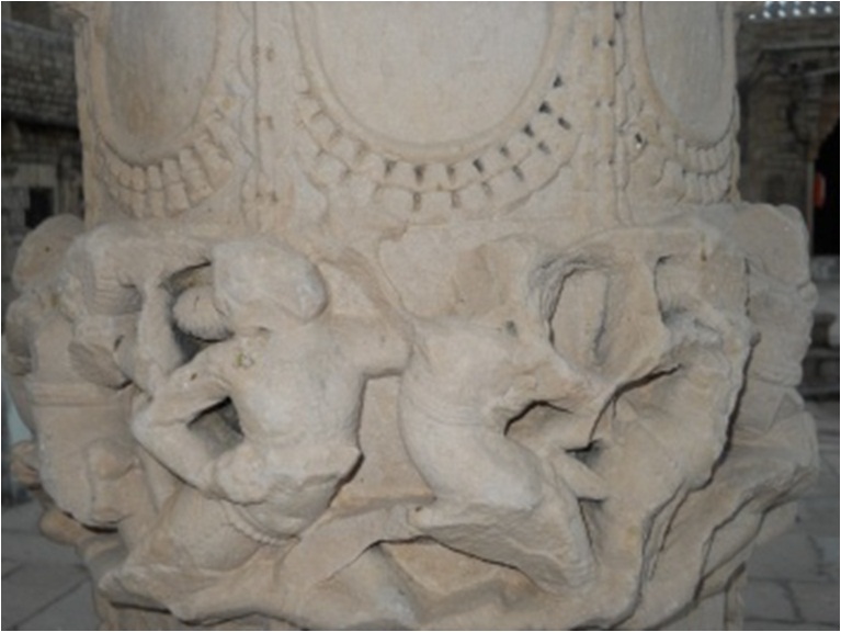 A pillar round in shape decorated with floral design, scroll coming fron Kirtimukh, human and Chain bell and lower part octogonal plain.