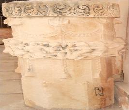 | Description / विवरण | A pillar part of temple decorated with floral design round band at top. A scroll and Kirti Mukhas carved below floral band but mutilated. Flying human band carved on middle part. Bell and chain hang down on each alternate face above octogonal part. |