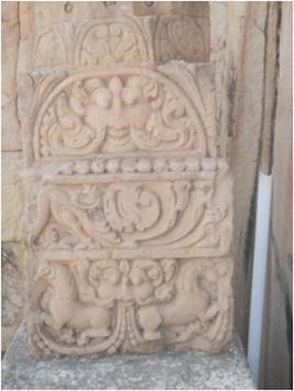 | Description / विवरण | It is a pillar base deeply carved with kirtimukh and griffin on lowest part, leafy design on second part. Third rectangular part has kirtimukh in semi circle and surmounted with octogonal part, having half lotus design. It was fixed in the wall of any temple,so only two parts carved. |