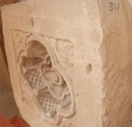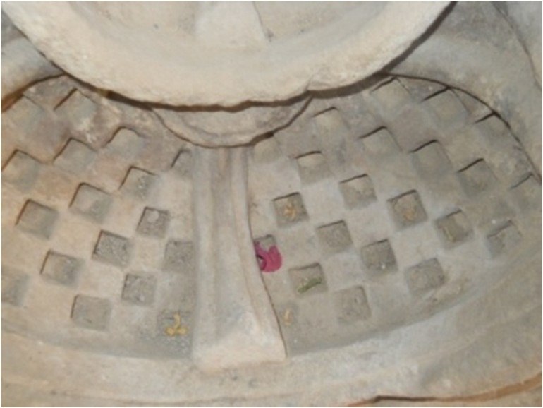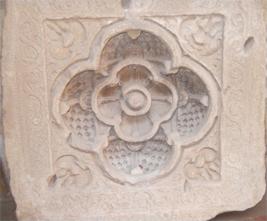 A square stone slab, carved deep with double lotus, outer frame has Kiriti Mukha faces of griffins at each corner. The frame is carved with floral design.