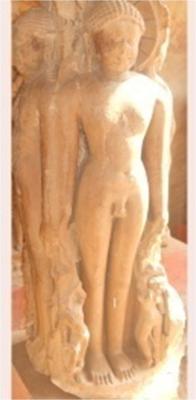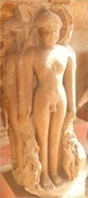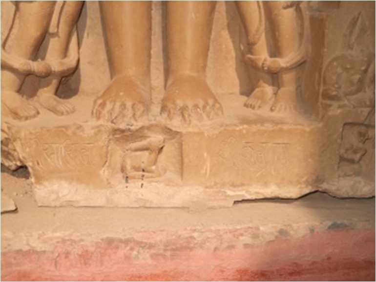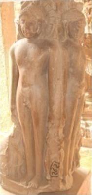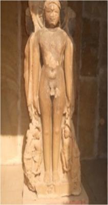 Jain tirthankars are shown standing on each four face. One face has standing nude tirthankar, having both side attendents. Yaskha and Yakshi carved on frame, are broken. A figure of stage is carved below his feet, having side inscription Jh pkfjy Jh dy.k The image can be identified with Tirthankas Shantinath. The standing Adinath is carved just back of above image and Parshwanath to left and Chandraprabh to right, having figurs of attendats.